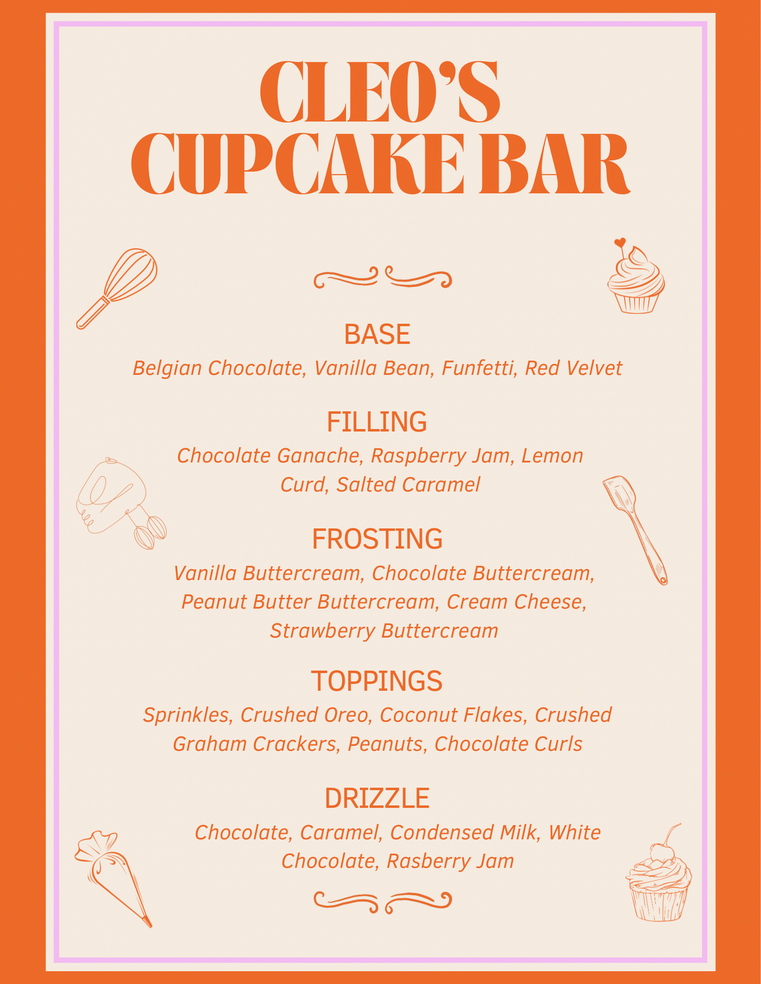 This is the signature menu available at all Cleo’s Cupcake Bar events, featuring fan-favorite flavors that are guaranteed to be a hit! From classic vanilla bean to rich chocolate and red velvet, there’s something for everyone.